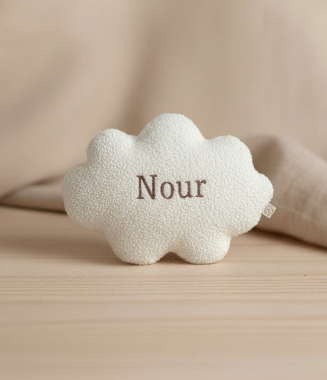 Ons schattige wolkenkussen is gemaakt van superzacht teddy-materiaal en geeft een warme, knusse uitstraling in de babykamer. Het kussen wordt met zorg geborduurd met de naam van jouw kleintje, waardoor het een uniek en persoonlijk item is.